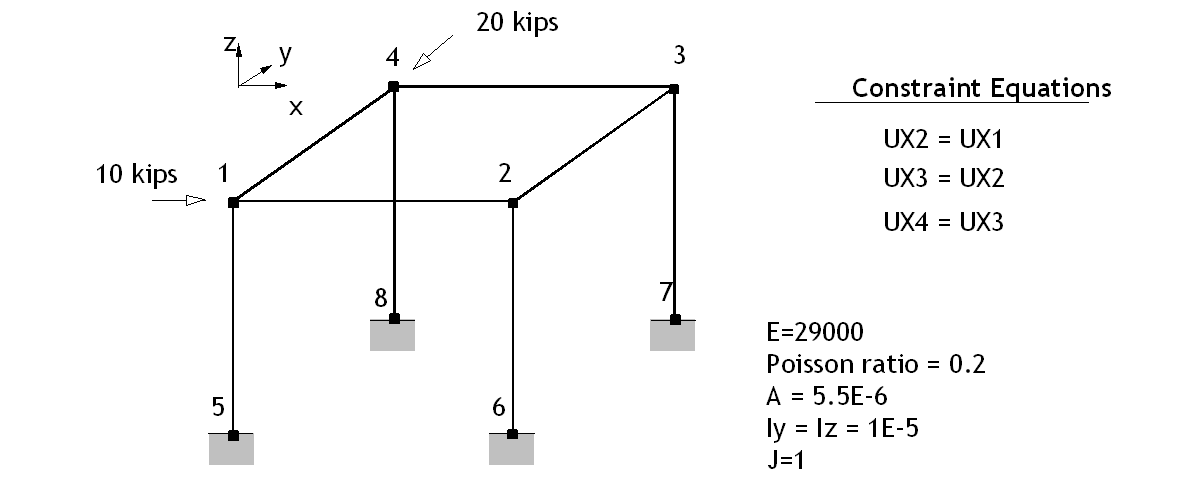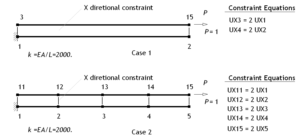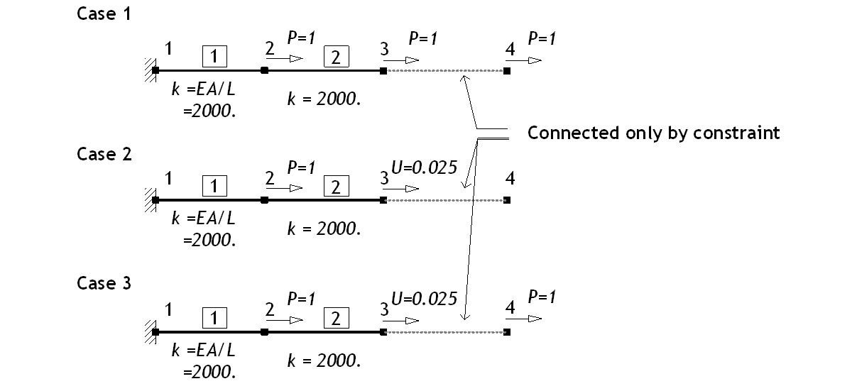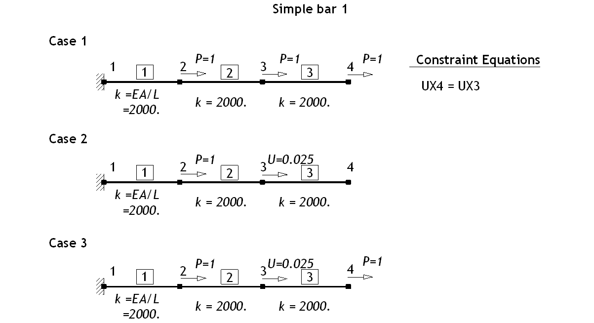 Figure E.10.1에 제시된 구조물에서 구속조건을 부과하여 해석을 수행하였다. 모든 하중 경우는 UX4 = UX3의 구속조건이 부과되어 있다. Case 1은 하중이 부과된 자유되에 대한 구속조건식을, Case 2는 변위가 부과된 자유도에 구속조건이 있는 경우를 검토하기 위한 것이다. Case 3은 변위가 부과된 자유도에 연결된 slave DOF에 하중을 가력한 경우이다. 본질적으로 모든 하중 경우는 동일한 응답을 나타내는 같은 문제로 자유도의 변위 응답을 모두 동일하만, 절점에서의 반력이 서로 다르게 표시될 수 있다.