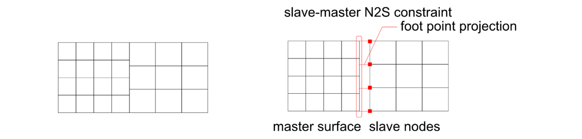 NodeToSurface 구속조건은 slave node를 master surface에 연결하는 구속조건을 의미한다. 입력시 slave surface – master surface 형태로 부과할 수 있는데 먼저 기입된 slave surface는 surface에 포함된 절점을 slave node로 변경되어 입력되게 된다.