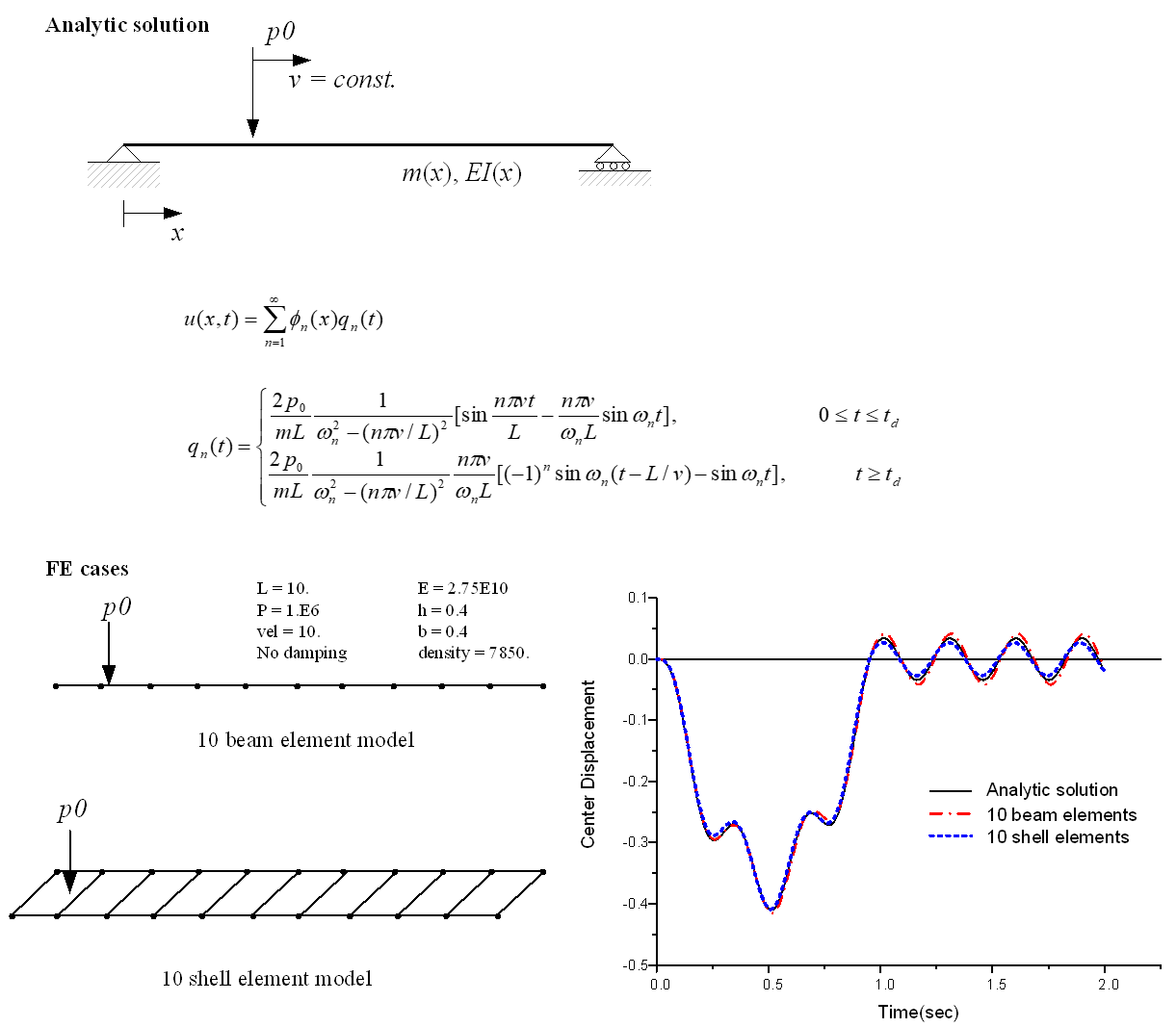 그림과 같이 단순보의 이동하중 해석을 수행하였다. 10개의 2절점 보요소 및 4절점 쉘요소를 이용하여 해석을 수행하였으며, 그 결과를 해석해와 비교하였다.