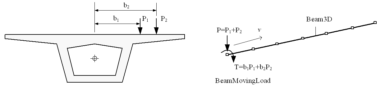 경우에 따라서 Figure E.12.2와 같이 보 요소를 이용한 간략화된 해석이 필요할 때가 있다. 이때 보의 도심에서 이격된 하중은 수직하중과 회전모멘트를 이동하중으로 선택하면 된다. 보 위를 지나는 모멘트를 이동시키기 위해서는 BeamMoving 하중을 사용해야 한다. BeamMoving 하중은 모멘트성분이 없을 경우 LineMoving 하중과 동일하다. 하지만 보요소에서만 적용해야 한다. 반면에 LineMoving 하중은 보를 포함하여 요소의 모서리 위를 이동시킬수 있다.