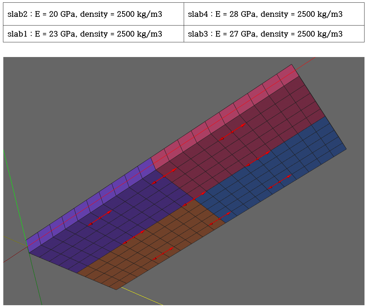 두께가 1.0 m인 20m*10m의 단순지지된 슬래브를 대상으로 쉘요소(S4F)와 솔리드요소(C3D8)로 모델링한 경우에 대한 정적 및 모달 모델업데이팅을 검증한다. 그림과 같이 4개 영역에 대한 물성치를 적용하여 고유치해석 및 자중에 대한 해석을 수행하여 인공 측정 결과를 생성하였다. 단일 물성치를 적용하여 인공 측정 결과 생성시 사용된 4개 영역에 대한 물성치를 잘 추정하는지 검증하였다. 9개의 strain sensor를 적용하였다.