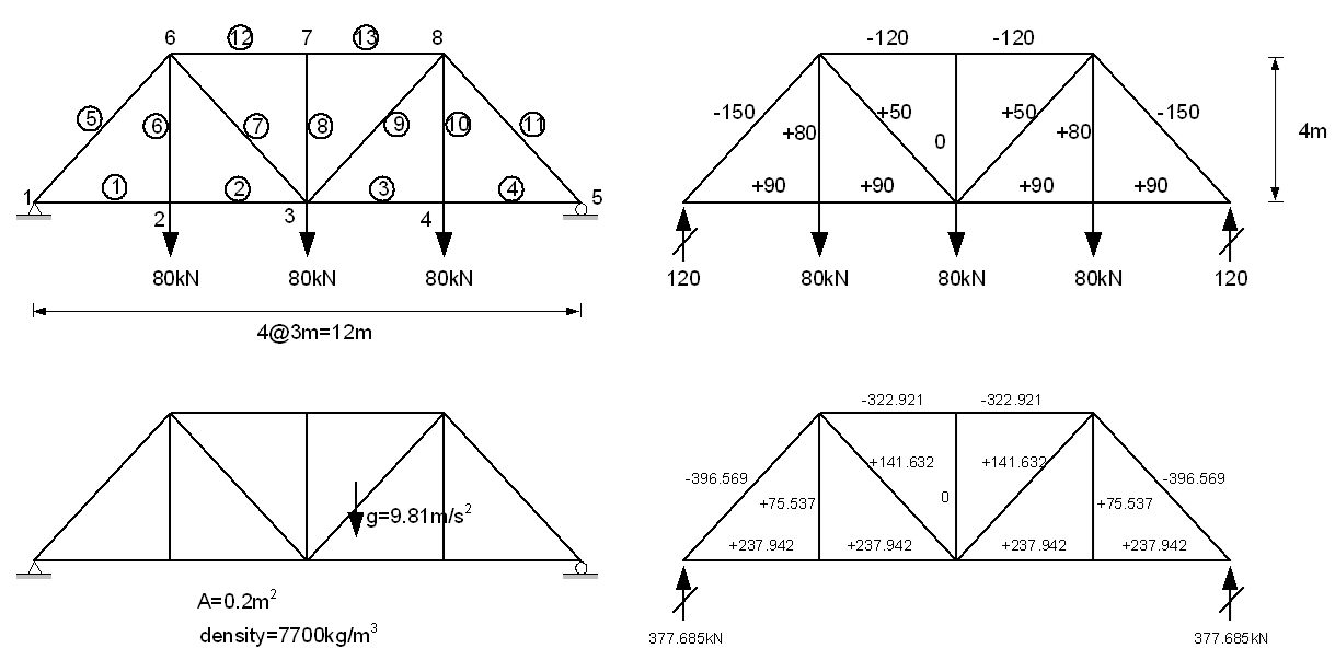 그림과 같은 평면트러스에서 집중하중이 가력되는 경우, 자중이 가력되는 경우와 주파수해석을 수행하였다.