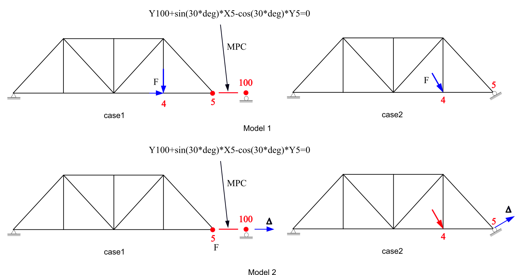 앞 절과 같은 트러스 구조를 대상으로 Support 구속조건, Displacement 하중, Concentric 하중에 UCS적용을 검증한다. 그림과 같이 두 모델을 제시하였으며, Model 1은 Support 구속조건, Concentric 하중에 대한 검증을, Model 2는 Displacement 하중에 대한 검증이다. Model1에서 Concentric 하중 검증으 위해 절점4에 X, Y 방향 하중을 별도로 정의한 것과, 회전한 후 부과하여 비교한다. 이때 하중벡터는 동일한 벡터이다. 회전된 Support 조건이나 회전된 지점에 대한 Displacement 하중을 부과하는 것과 같은 효과를 내기 위해 각 모델의 case 1은 별도의 절점 100을 생성하고 이를 절점 5와 연결하였다. 이후 MPC 구속조건을 부과한다. 각 모델에서 case1과 case2는 동일한 결과를 나타내야만 한다.