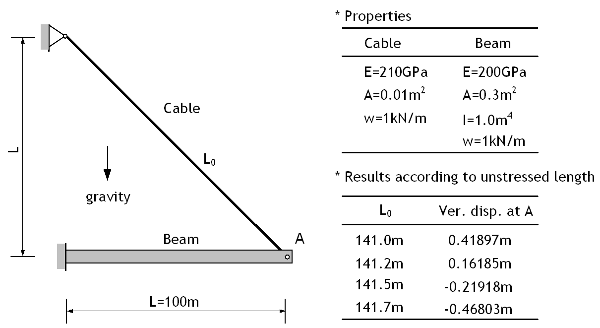 Figure E.9.3과 같이 케이블과 보로 구성된 간단한 구조물에 대해 해석을 수행하여 탄성현수선 요소를 검증하였다. 케이블은 1개의 탄성현수선 요소로, 보는 1개의 선형보요소로 모델링하였다. 탄성현수선 요소의 무응력길이 \(\small L_{0}\)를 변화시켜가며 자유단 A에서의 수직변위를 계산하였으며 서울대학교 이해성 교수 연구팀에서 보유하고 있는 사장교 해석용 인하우스 프로그램(이해성 등, 2004)과 비교하여 결과가 정확히 일치함을 확인하였다.
